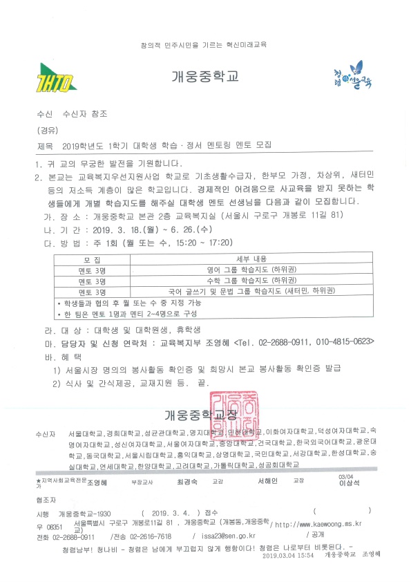 (교육봉사)2019학년도 1학기 개웅중학교 대학생 학습.정서 멘토링 모집