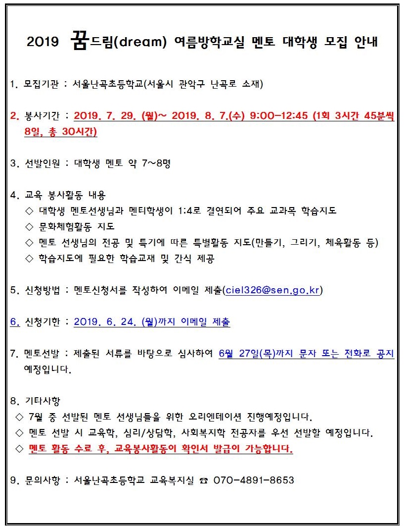 (교육봉사)서울난곡초등학교 꿈드림 여름방학교실 멘토 대학생 모집 안내