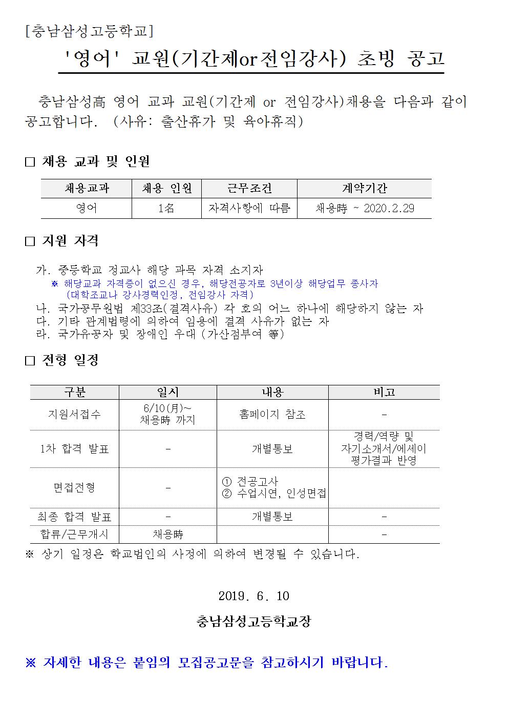 (채용안내)충남삼성고등학교 영어 교원(기간제or전임강사) 초빙 공고
