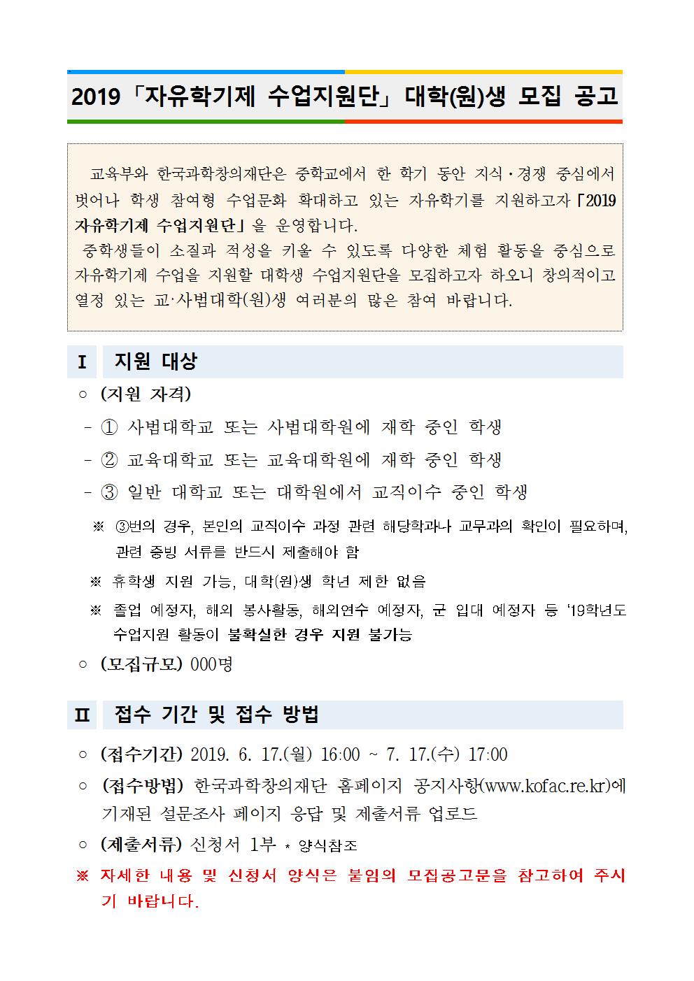 2019년 2학기 자유학기제 수업지원단 모집 공고(대학교용).hwp