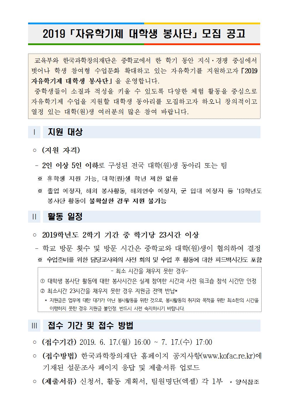 2019년 2학기 자유학기제 대학생 봉사단 모집 공고(대학교용).hwp