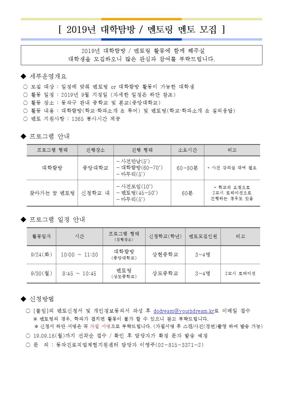 [동진체발 19-071] 붙임 2019년 9월 대학생 멘토 모집 안내문.hwp