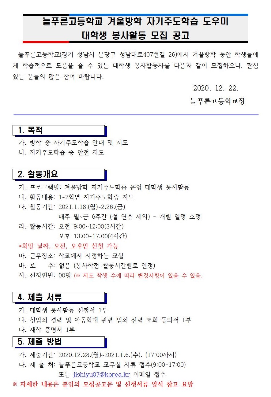 | 제 목 | (교육봉사)늘푸른고등학교 겨울방학 자기주도학습 도우미 대학생 봉사활동 모집 공고 | ||||