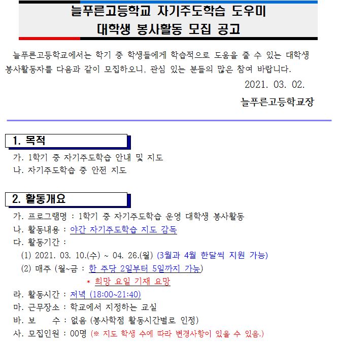 | 제 목 | (교육봉사)늘푸른고등학교 자기주도학습 도우미 대학생 봉사활동 모집 공고 | ||||