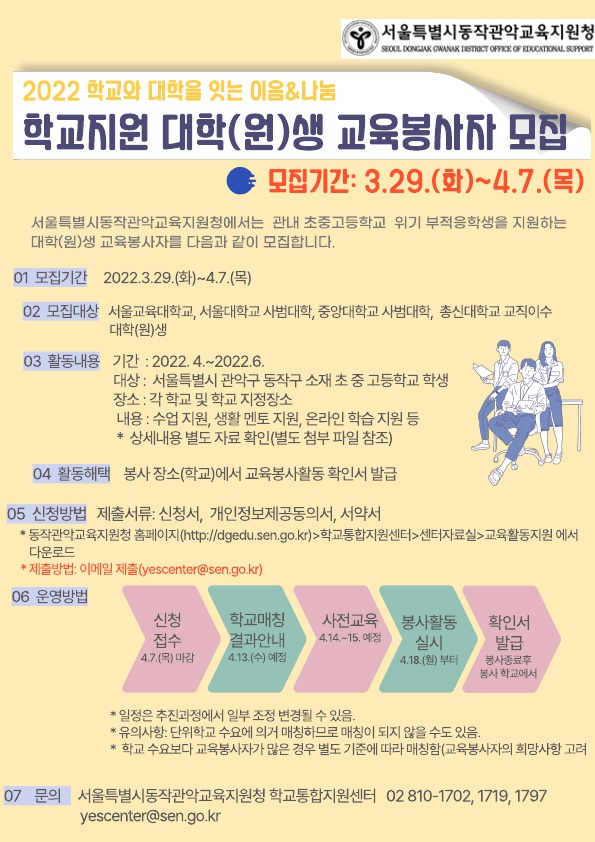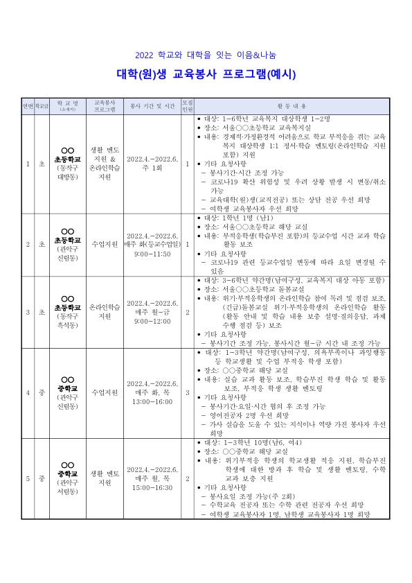 (교육봉사) 2022-1학기 동작관악 이음&나눔 대학생 교육 봉사활동 신청 안내